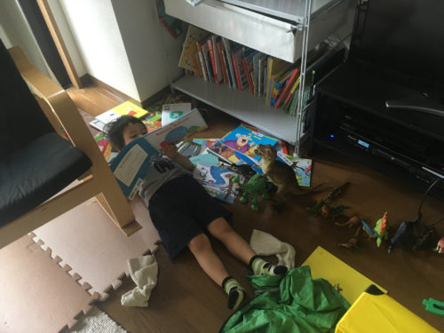 もうすぐで3歳になる先生。順調に成長をしているが、同時に生意気化が止まらない。嫌なものは嫌、好きなものは好き、という生物としては当たり前の感情なんだろうけど、それを声高に主張するものだからたちが悪い笑。この前も妙に静かにしているなあ(静かにしている時はだいたい悪いことをしているとき)と思ったら、こんな感じだった。恐竜と遊んでいてそれに飽きて、本棚から絵本を出しては眺めてはその場に捨てるという事を繰り返していた。後でちゃんと片づけしてね、と言ったら「片づけしたくないし・・」と返ってきた。もちろんそのあとは片づける、片づけないの2歳児との喧嘩に発展するのであった。最近はこんなことが多いな笑。