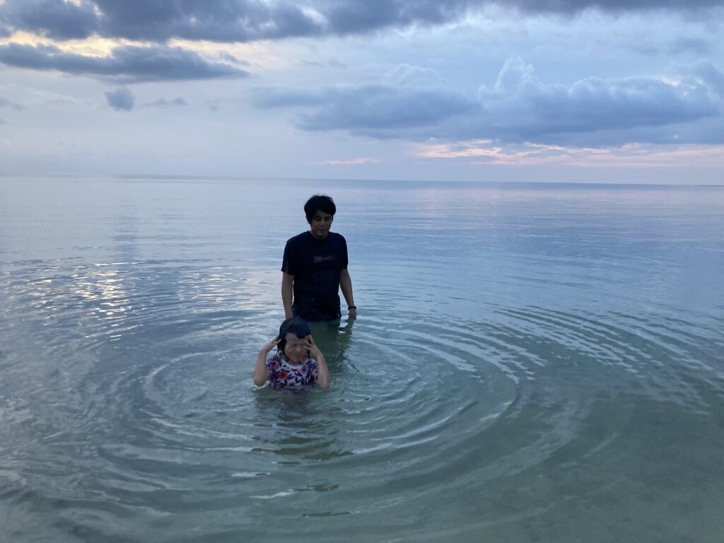 ツアーが終わってからはいつものスーパーにより、アイスや飲み物を調達。バンガローに帰ってから、裏のビーチに夕日を見に散歩。そしてそのまま夕日を見ながら服のまま水に入る。周りには誰もおらず、音もしない。こういう、静けさも良かったな。