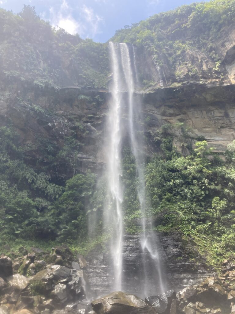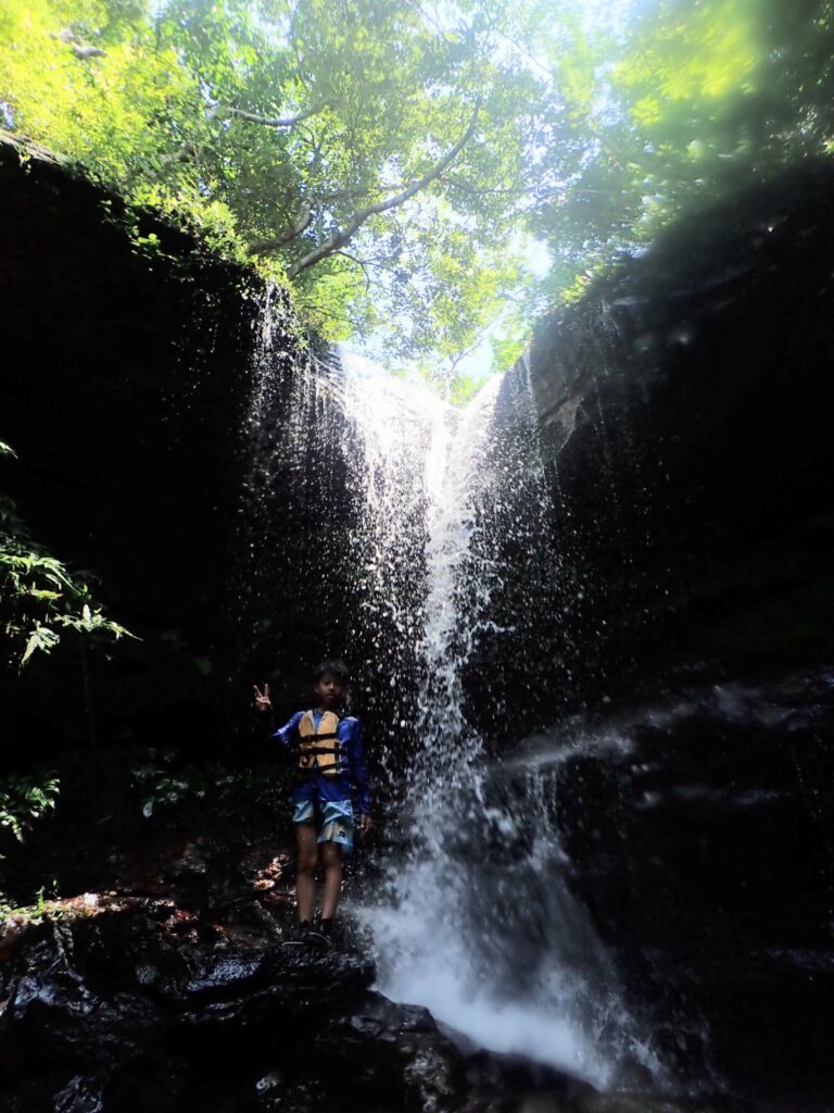 苦労してたどり着いた滝はすごい・・、の一言で、落ちてくる水が途中から霧になるぐらいの落下距離。真下にはいけないのだが、滝つぼに飛び込みスポットがあり、勇気をもって子供たちが飛び込んだりしている。水はやはり冷たい。一度入ってしまえばいいんだろうけど、下の子はそれが中々できずに不貞腐れモード。が、ガイドさんの協力もあって、一気にテンションがあがって浅瀬で暴れまくり。子供は本当、こういう時の手のひら返しが早い。滝つぼの少しずれた所に池のようなスペースがあり、そこで遊びまくった。見たこともないような手長エビも発見。