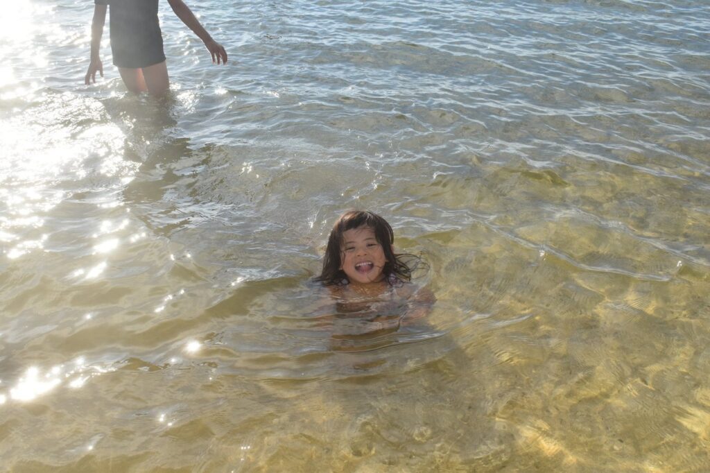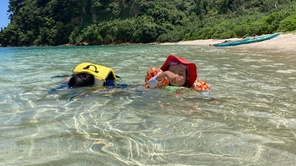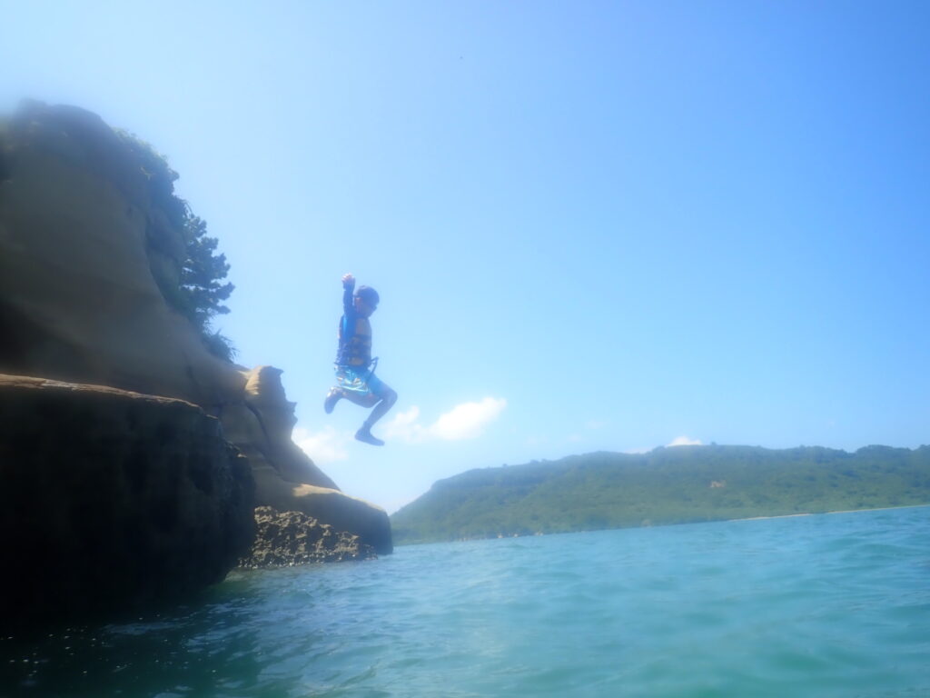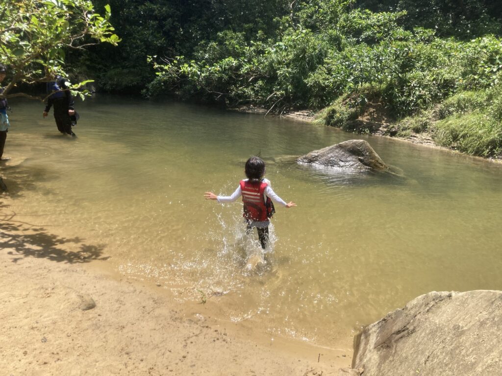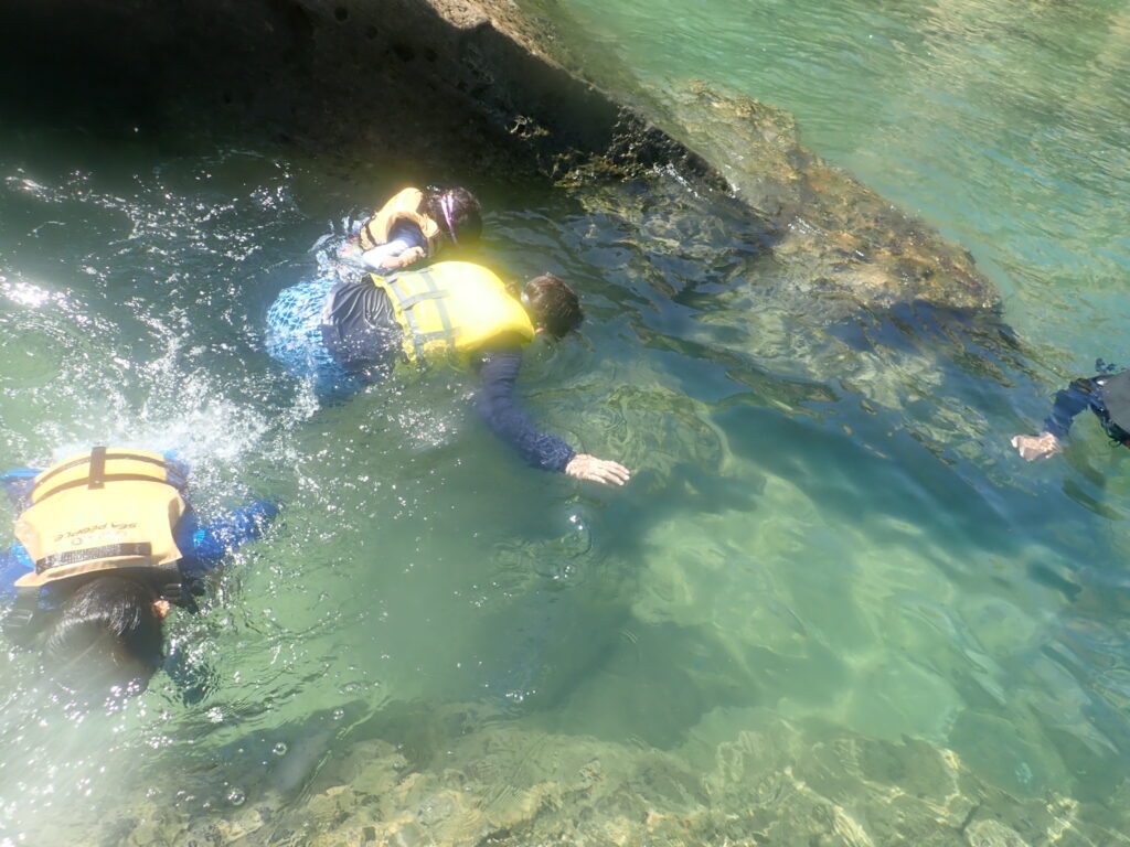 今回は子供たちの成長を感じた。普段から海での遊びをしているから問題なく水に入っていたし、高い所から飛び降りたりとか、今までであったら「怖い」とか「気持ち悪い」とか、言っていそうな所を自分から動いてくれた。また、二人ともガイドさんになついてくれて、普通に会話をしたり質問をしていた。親以外の大人との接し方に成長を感じた。