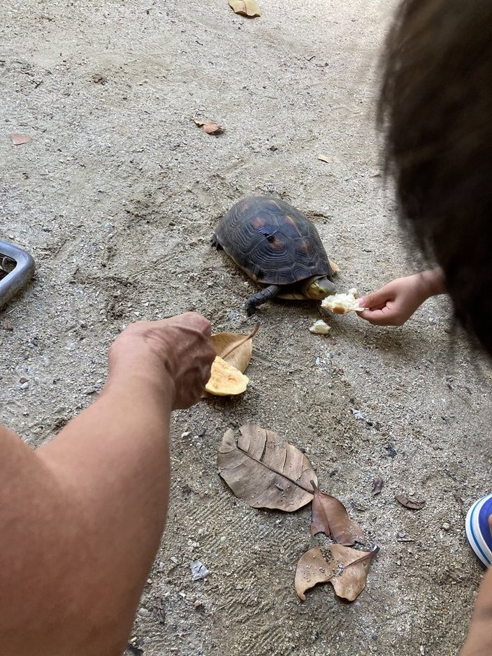 ビーチを上がってからは、近くの飲食店でお昼を食べる。すでに営業時間が終わっていたが、おばあちゃんが快く迎え入れてくれた。ここら辺、子供がいると強いよね。なんと、このおばあちゃんは、天然記念物である亀を餌付けしており、見せてくれた。見せてくれたところか、お父さん持ってきて!と天然記念物をキャッチさせられる。ここに持ってきて、子供たちに見せてよ、とのことで、恐る恐る天然記念物である亀を運ぶ。この亀は、とにかくパンが好きで、パンを置くと、亀とは思えないようなスピードで食べにきていた。西表島島の天然記念物については事前に調べていて、触ってはいけないとか、見かけても遠くから見るだけにしてほしいとの注意をいくつもの本で読んでいたが、そこら辺のルールを一気に飛び越えてしまうこの世界観。おばあちゃん曰く、こんなの何が天然記念物なんだろうね?とのことであった。